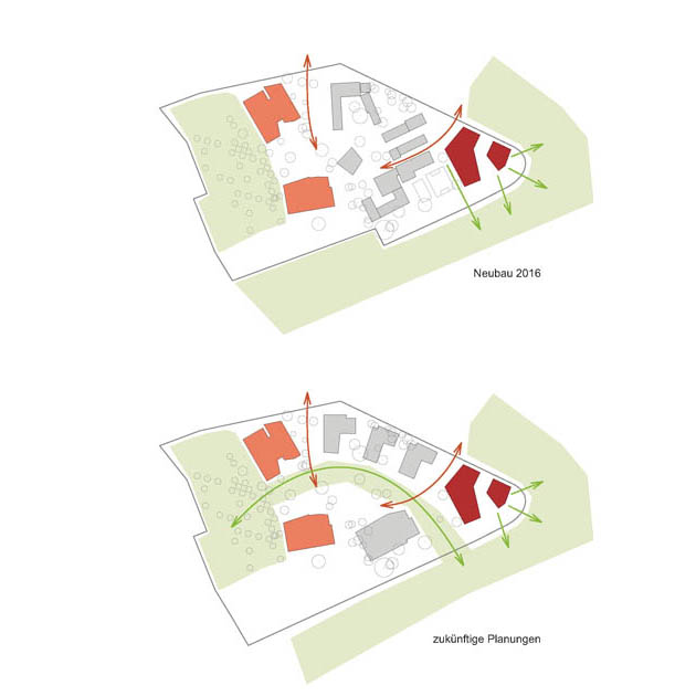 Die beiden mitten im Wald stehenden Gebäude für die Eingangsklasse und die Klassen 1-3 der Freien Waldorfschule wurden in reiner Holzbauweise errichtet und nach nur 9 Monaten Bauzeit im Mai 2016 fertig gestellt. Das Foyer des zweigeschossigen Gebäudes mit zuschaltbarem Speiseraum öffnet sich großzügig nach Osten. Wenn die Kinder von Westen in das Haus kommen, empfängt sie die flach stehende Morgensonne zum Morgenkreis. Über Foyer und Galerie sind die drei Klassenbereiche erschlossen. Klasse und Ganztagsraum mit Küche bilden „Jahrgangs-Wohnungen“ und haben über die Garderobe einen eigenen direkten Zugang ins Freie.
