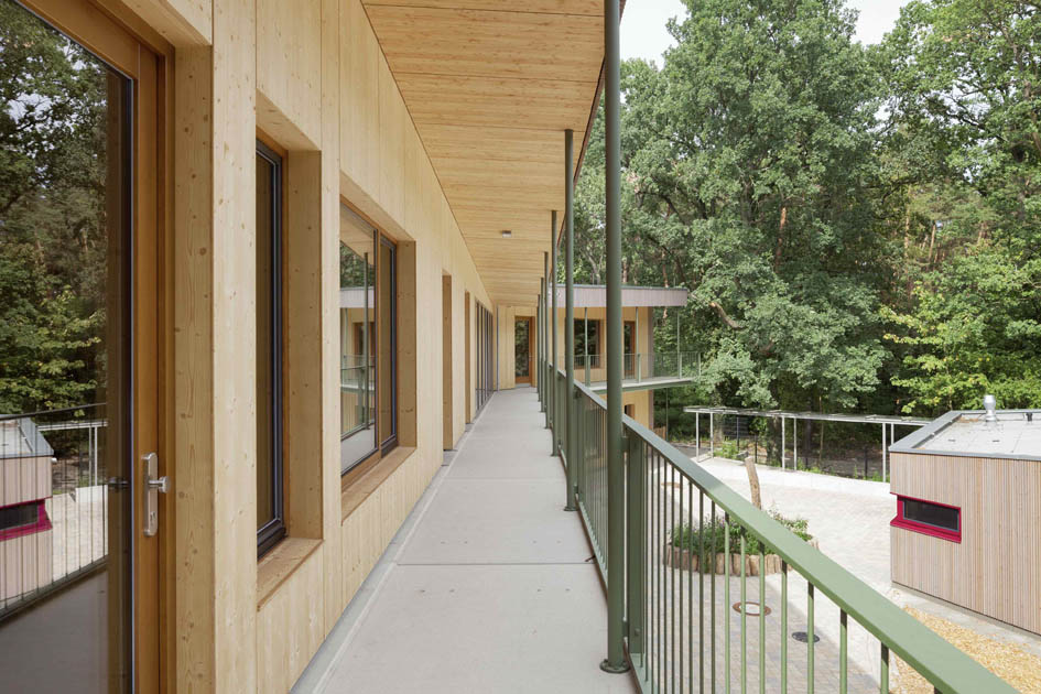 Das solitäre Gebäude für die Waldklasse der Kleinen ist tiefer in das abschüssige Gelände eingebettet, gibt somit auch für das zweigeschossige Haus den Blick in den Wald frei und hat einen geschützten, separaten Pausenhof. Die glasüberdeckte Rampe im Hof dient als behindertengerechte und ist wettergeschützte Verbindung der Gebäude. Durch die Verwendung naturbelassener, ökologisch unbedenklicher Materialien erhält das Ensemble einen robusten und zugleich atmosphärischen Charakter.