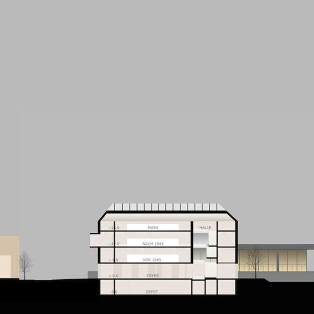 Selbstbewusst in den Park gestellt wird das Haus durch seine Präsenz sowohl Teil der Stadt Dessau als auch Baustein des Bauhauses. Es wird von den wesentlichen Sichtachsen wahrgenommen. Auf einem Sockel stehend, leicht über der Parkebene, wird eine starke räumliche Beziehung in den Park geschaffen. Die Positionierung des Hauses schützt den Baumbestand. Die Besucherin oder der Besucher können die Ausstellung von oben nach unten durchwandern oder sich direkt in die Wechselausstellung im 1-2 OG besuchen. Die Topoi bespielen die Ebenen und stehen in starker gegenseitiger räumlicher Beziehung.